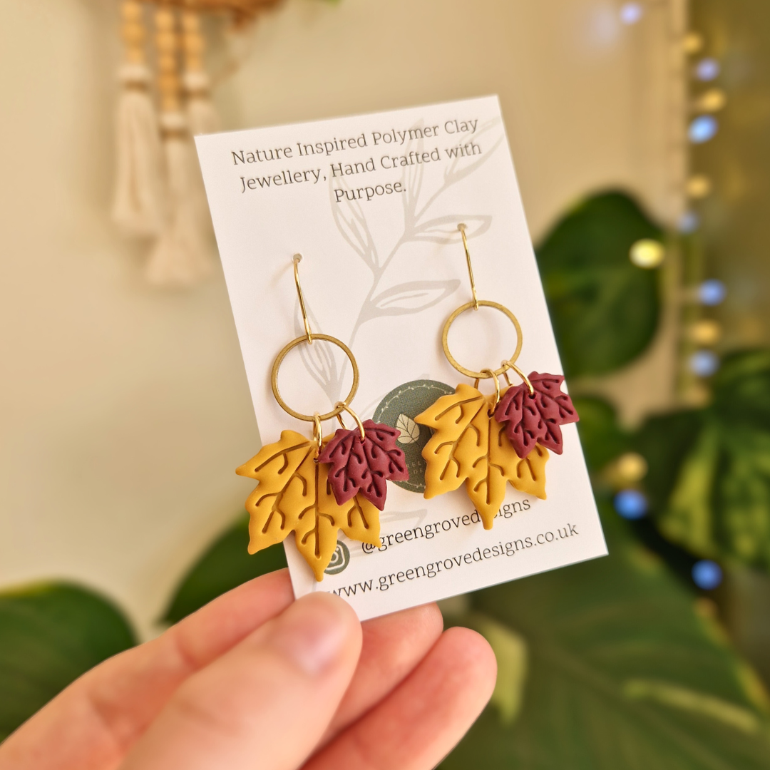 This stunning pair of duo maple leaf drop earrings in yellow ochre and maroon feature a classic brass connector and have proven to be a bestseller both at markets and in-store so far this season. They are a lightweight, statement pair of earrings that can be dressed up or down depending on the occasion.