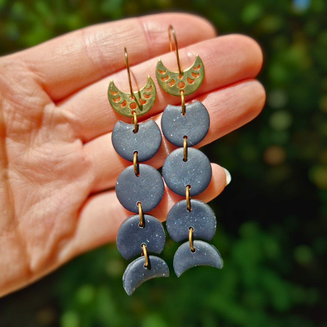 A Statement yet lightweight pair of bohemian moon phase earrings in a deep navy colour, elevated with a subtle sparkle that is subtle yet effective, and adorned with a raw brass charm with moon cut-outs. All of our hook earrings come with rubber stoppers.