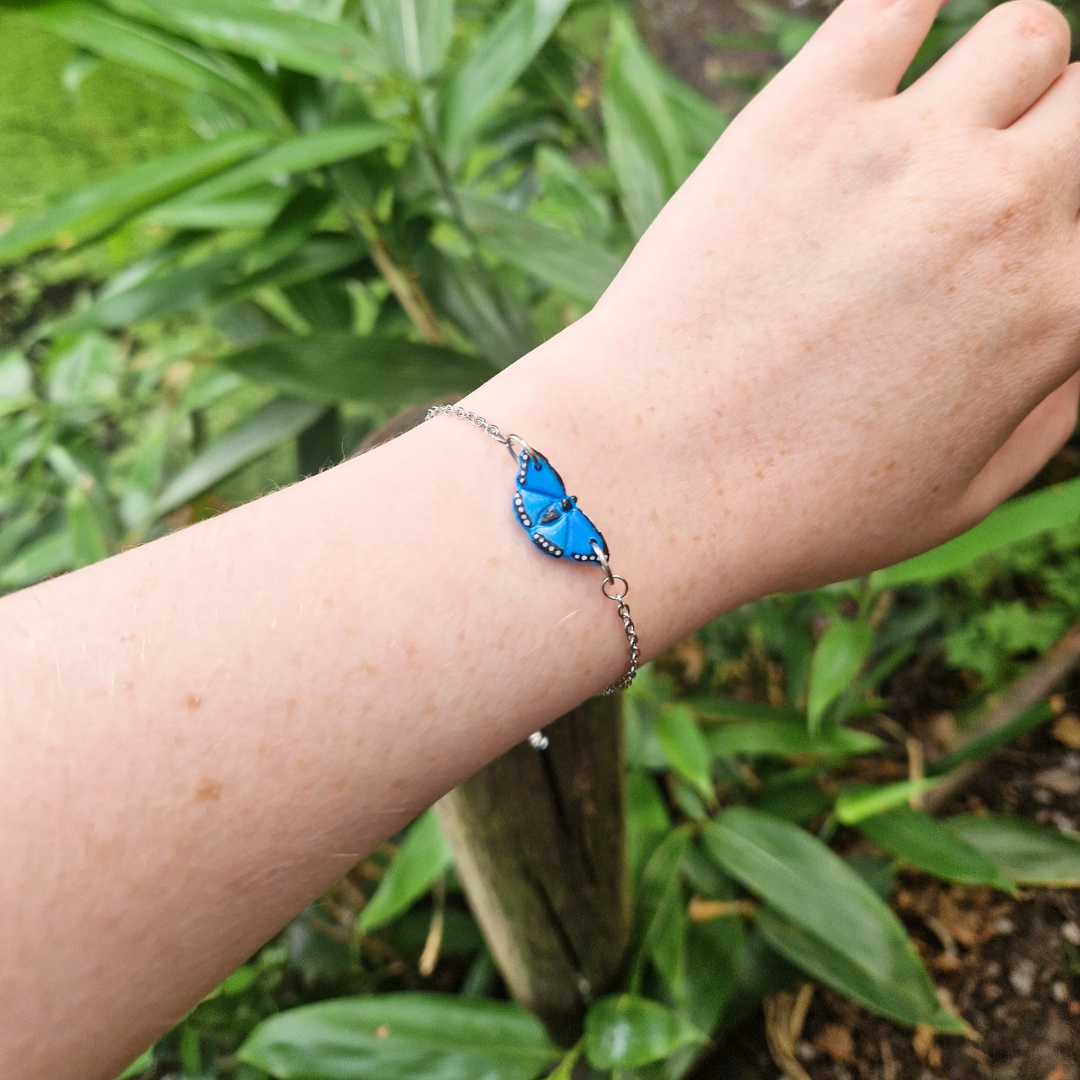 Our Blue Morpho butterfly bracelet is an exquisitely handcrafted piece, made using polymer clay for the base colour with a brush of metallic blue mica powder for it's iridescent effect, and finished by painting each detail on by hand with a fine paintbrush. Each piece is then varnished. This piece of jewellery celebrates the beauty of this beloved butterfly, and make for a perfect gift for garden and nature lovers.