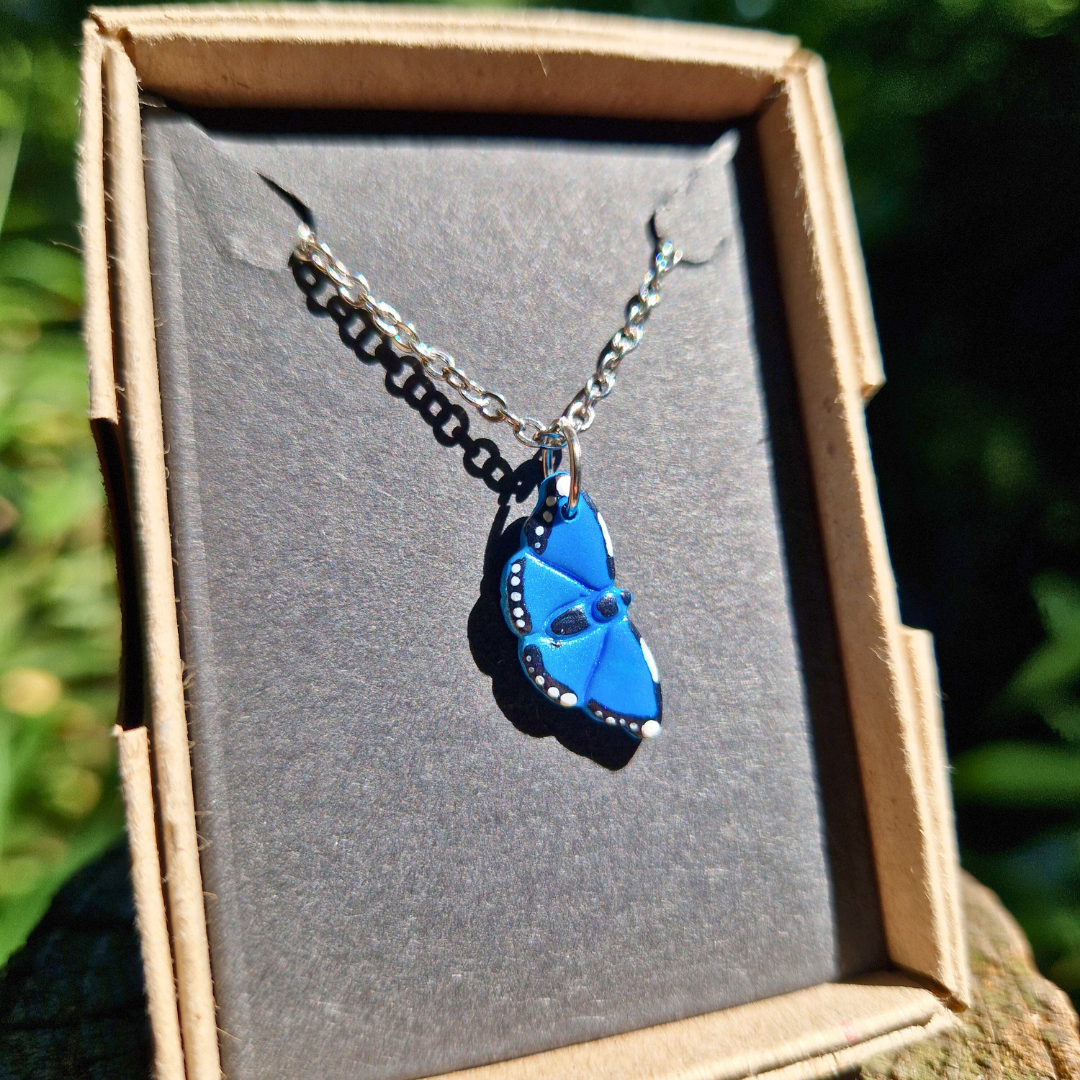 Our Blue Morpho butterfly necklace is an exquisitely handcrafted piece, made using polymer clay for the base colour with a brush of metallic blue mica powder for it's iridescent effect, and finished by painting each detail on by hand with a fine paintbrush. Each piece is then varnished. This little pendant necklace celebrate the beauty of this beloved butterfly, and make for a perfect gift for garden and nature lovers.