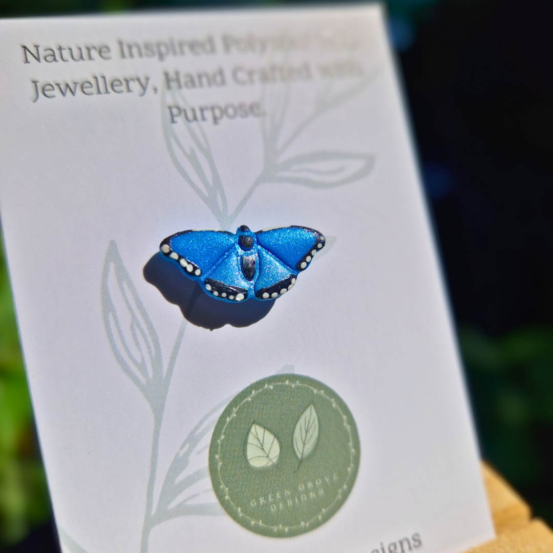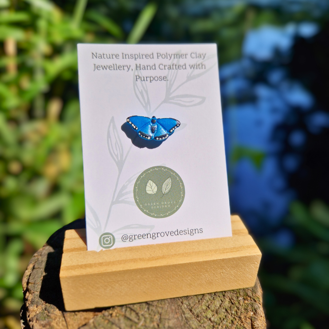Our Blue Morpho butterfly pin brooches are an exquisitely handcrafted piece, made using polymer clay for the base colour with a brush of metallic blue mica powder for its iridescent effect, and finished by painting each detail on by hand with a fine paintbrush. Each piece is then varnished. These little pins celebrate the beauty of this beloved butterfly, and make for a perfect gift for garden and nature lovers, ideal for lanyards, tote bags, cardigans etc.