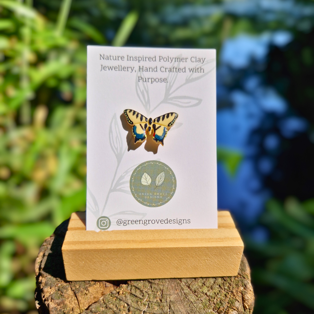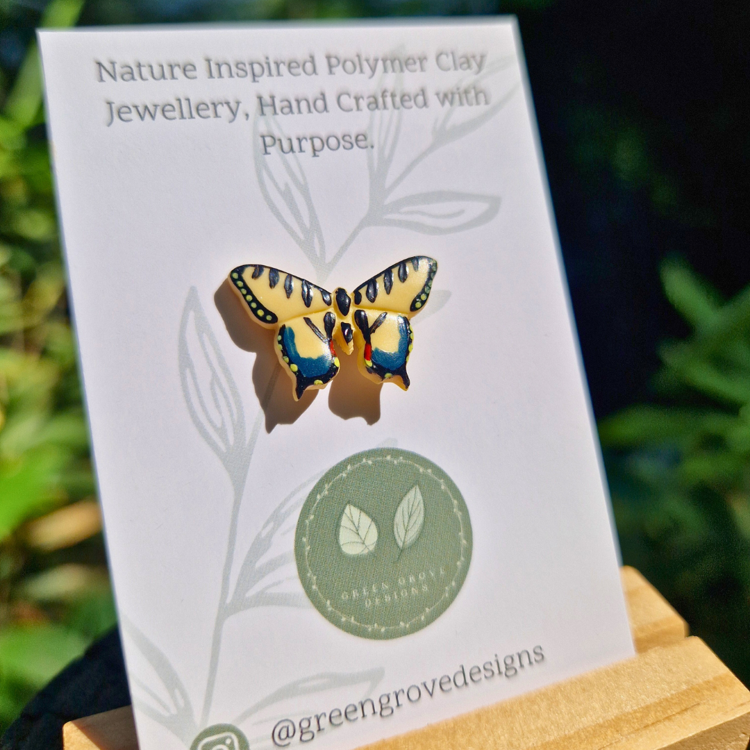 The Eastern Tiger Swallowtail butterfly is popular world wide, being one of the most widely known butterflies in the world! Our pins are crafted using polymer clay, then detailed with paints using a fine paintbrush in order to capture the delicate details of this beloved species. This piece is the perfect gift for nature lovers, ideal for placing on lanyards, cardigans, tote bags, etc.