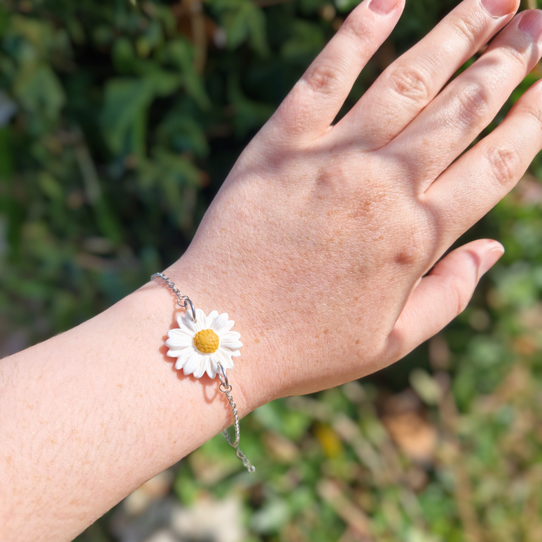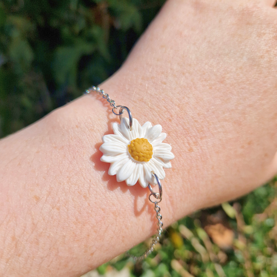 Introducing our new daisy bracelet, forming part of our ever-popular daisy set! Our daisies are meticulously hand crafted using polymer clay, then placed on a hypoallergenic and tarnish resistant stainless steel bracelet chain! Our bracelets are perfect for those who don't wear earrings, or for those looking to complete a set. We have matching necklaces, pins, earrings, and rings available.