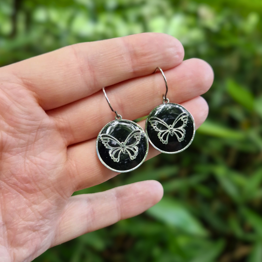 This minimalist yet effective pair of earrings feature a steel butterfly charm placed on polymer clay and secured with a layer of UV resin for a sleek finish that shines in the sunshine. Each pair is placed on hypoallergenic surgical steel hooks that are tarnish resistant and hard wearing. These butterflies can be dressed up or down and go with any outfit due to their simplicity! All of our hook earrings come with rubber stoppers.
