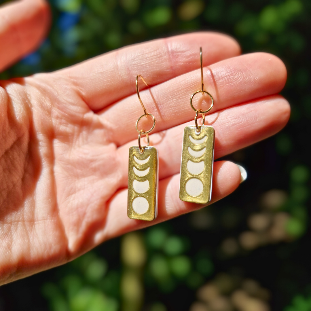 A stunning and mystical pair of bohemian moon phase earrings in minimalist white with subtle specks, adorned with classic raw brass charms, and elevated with resin to enhance the beauty of this design. This is a perfect pair of earrings for any outing and can be dressed up or down depending on the occasion! All of our hook earrings come with rubber stoppers.