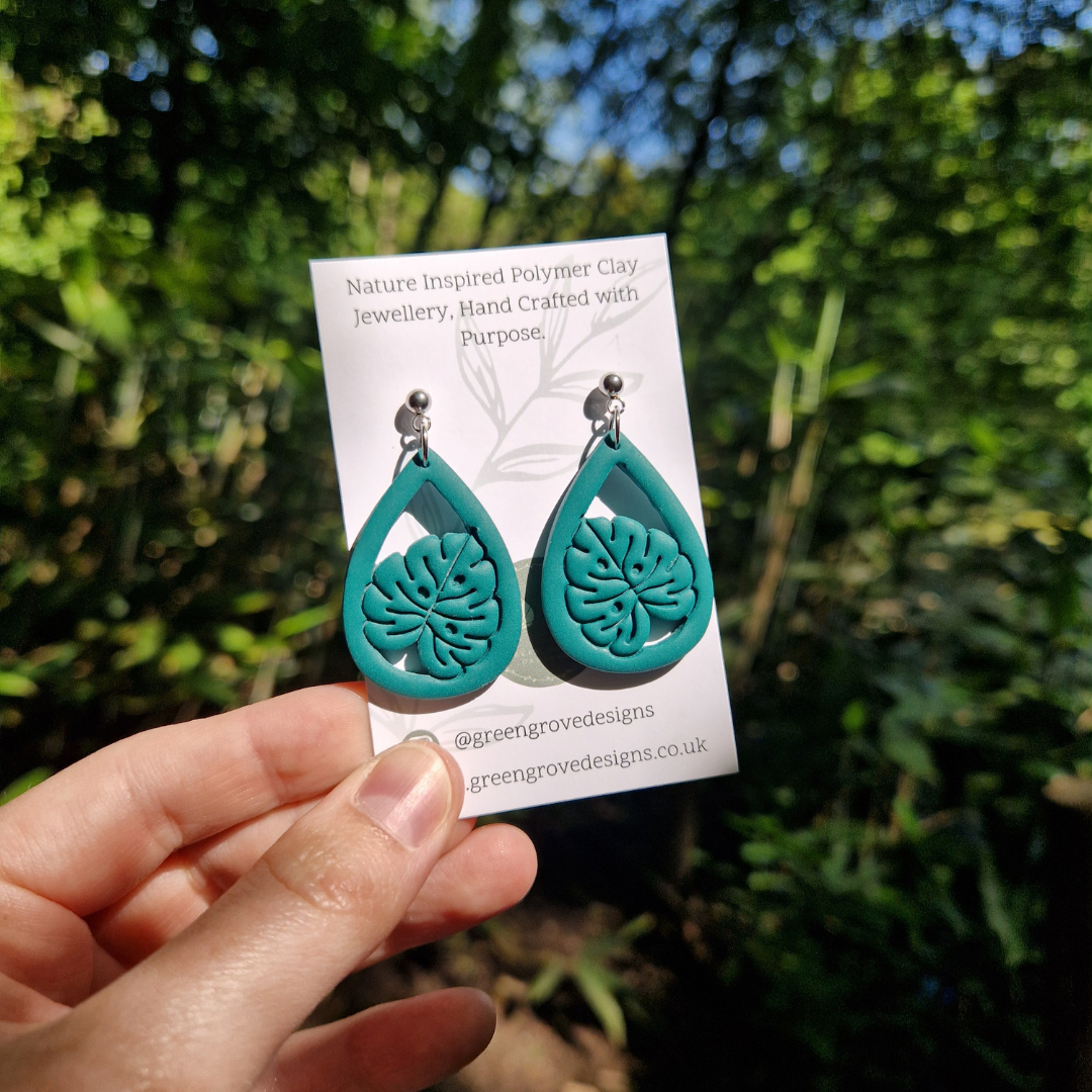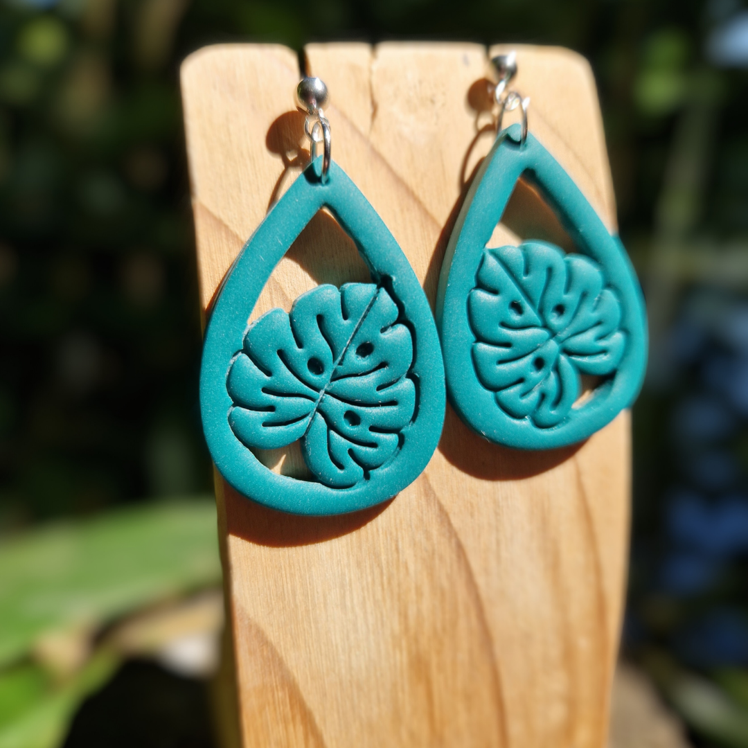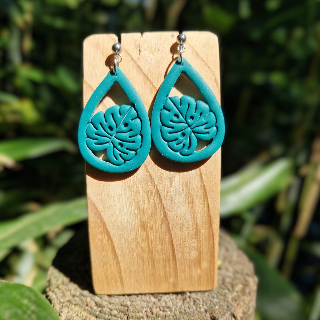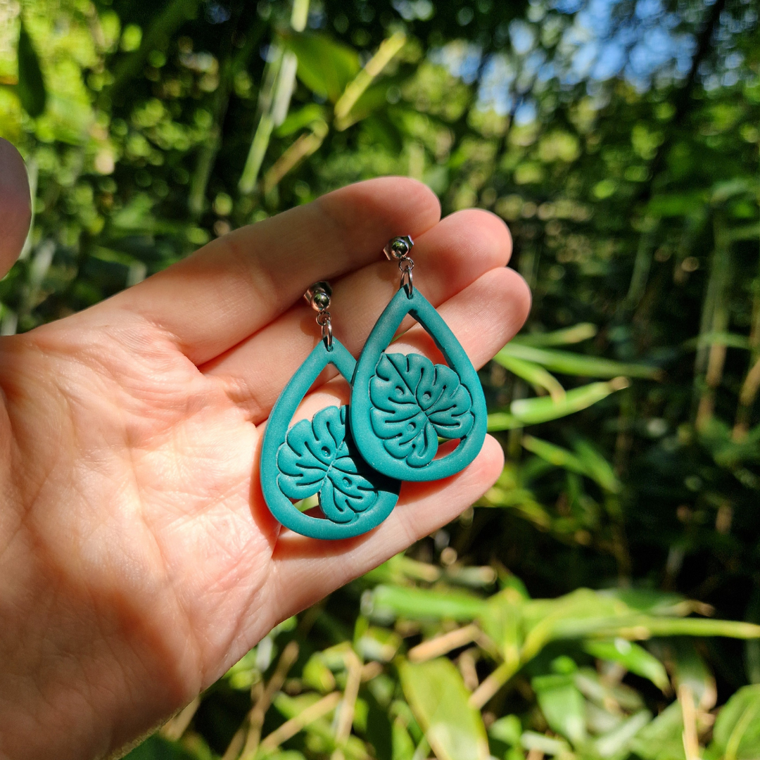 Statement Polymer Clay Tear Framed Monstera Drop Studs