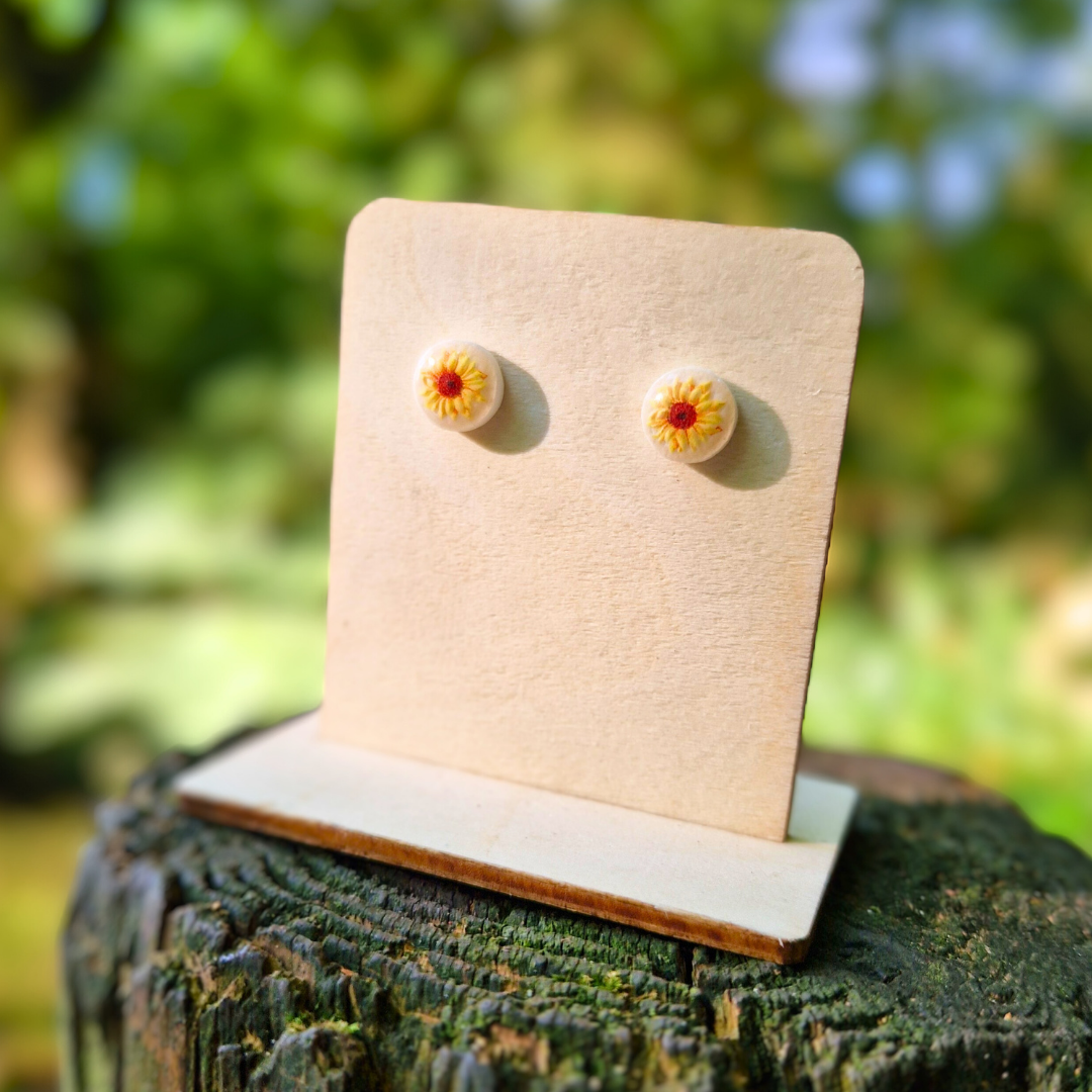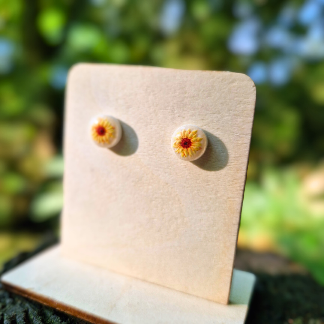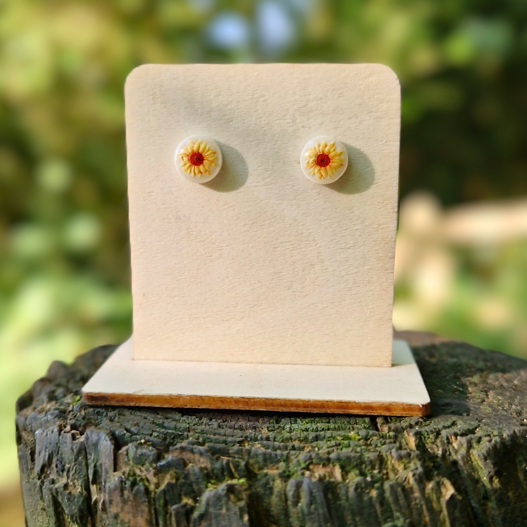 Brighten your look with these charming stud earrings, featuring a white background topped with a glossy resin layer and a delicate sunflower transfer. Handcrafted from polymer clay, these studs are inspired by late summer/the beginning of autumn. Our studs make for an ideal everyday pair of earrings that are perfect for all occasions!